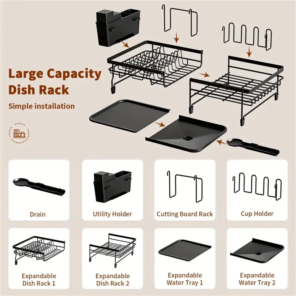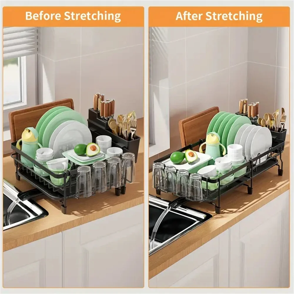 【EXTENDABLE & FOLDABLE】: Thanks to the smart expandable design, this dish drying rack is suitable for kitchen countertop of different sizes. When extended, it can be a large capacity kitchen dish rack perfect for plates, bowls, cups, glasses, and full sized pots or pans. When closed, it’s compact enough to place in sink or store in cupboard without taking much space. Dimensions: (30 to 53)L x 30W x 12H CM( Not Contain Untensil Holder )